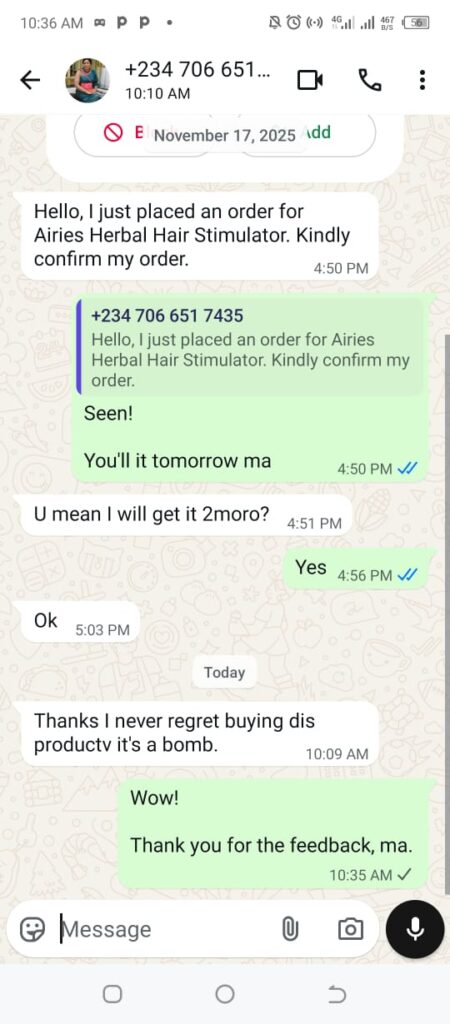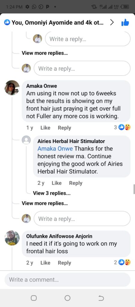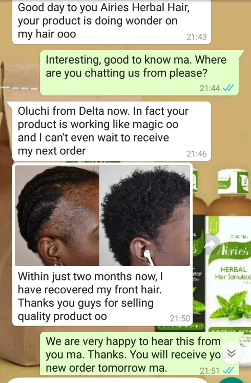 “I was losing my edges badly after childbirth. A friend recommended Airies, and I gave it a shot. Now my edges are back, fuller than before. I even recommended it to my mum, and it worked for her grey hair too!